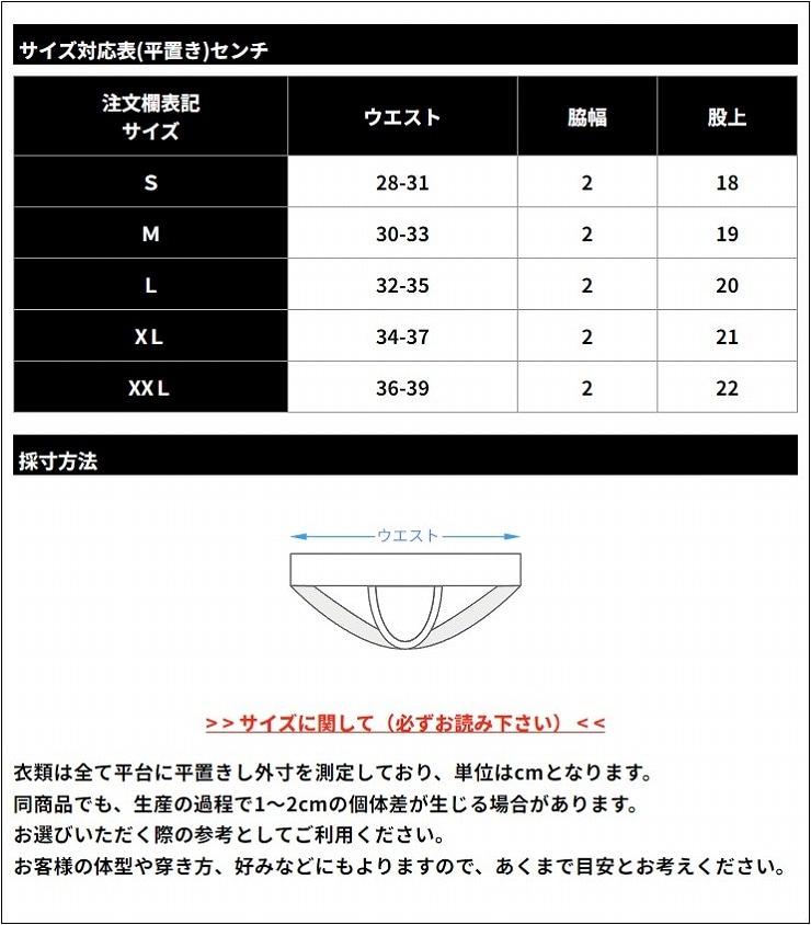 ウエストサイズ(平置きの目安) S 約28-31cm M 約30-33cm L 約32-35cm XL 約34-37cm XXL 約36-39cm ※洗濯の際、他のものと分けてご面倒でも手洗いをおすすめします。洗濯後は形を整えてすぐに干してください。乾燥機の使用はお控えください。 ※生地にプリントしているため、伸縮時や縫製箇所等、色が薄く見える場合があります。 ※転写プリントのため、裏地は白色となります。 ※1枚のみでの販売です。 [お取り扱い上のご注意] この製品は装飾性を高めるため繊細な素材を用い一部に金属を使用しています。 丁寧にやさしくお取り扱いください。 洗濯は金属部分に気をつけ40℃上限のぬるま湯洗濯液を使い単独手洗いをしてください。 ※ やむを得ず洗濯機を使用する場合はクッション性のある厚手の洗濯ネットを必ずご利用ください ※ 手洗いコース・ソフトコースなどを選び短時間で単独洗濯してください ※ 洗濯槽、製品の金属部分や他のものなど、思わぬキズや破損につながる場合がありますので十分にご注意ください ※ 脱水は洗濯機で行わず必ず乾いたタオルなどでしっかり水気を吸い取ってください 投げたり乱暴な取り扱いは思わぬケガや破損につながる場合がありますので十分にご注意ください。 金属部分の引っかけやものに当たるなど着脱時や着衣中は十分にご注意ください。 製品を永く大切にご愛用いただくため、以上の点を忘れないように十分注意ししっかり守ってください。