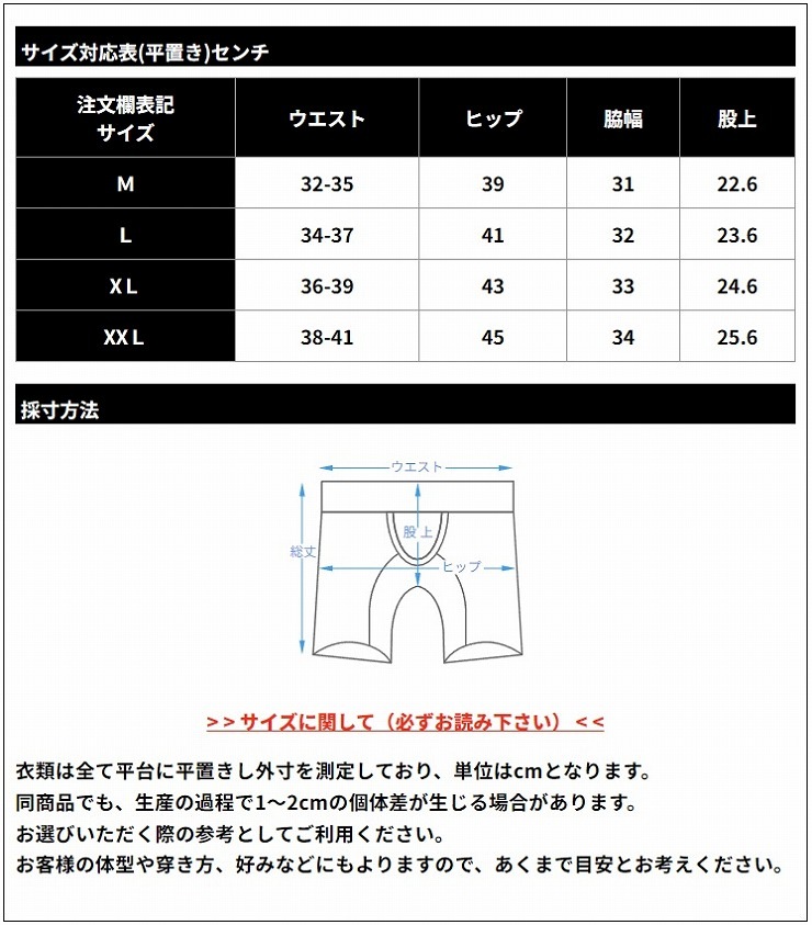 ウエストサイズ(平置きの目安) M 約32-35cm L 約34-37cm XL 約36-39cm XXL 約38-41cm ※洗濯の際、他のものと分けてご面倒でも手洗いをおすすめします。洗濯後は形を整えてすぐに干してください。乾燥機の使用はお控えください。 ※色落ちすることがありますので単独で洗濯してください。 ※生地を染めているため、裏地は表側と同じ色となります。 ※プリントはクラッシュ加工となります。