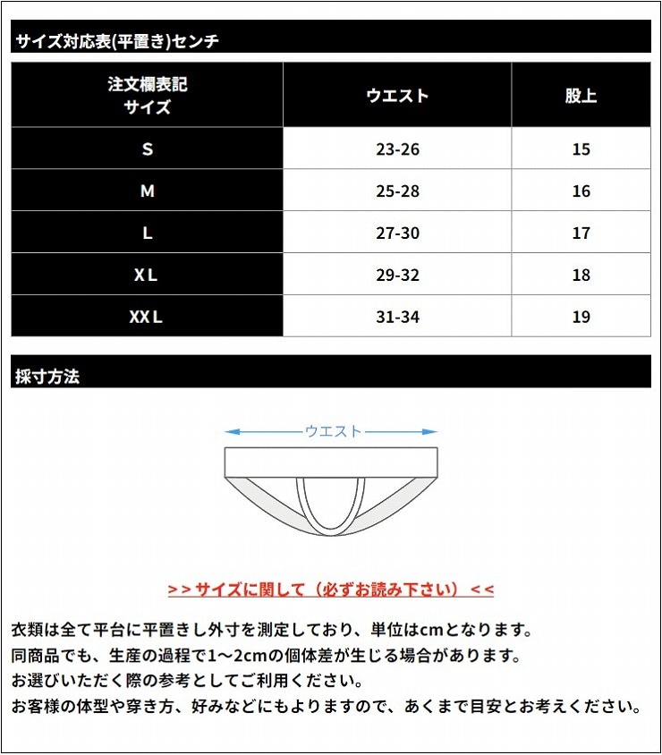ウエストサイズ(平置きの目安) S 約23-26cm M 約25-28cm L 約27-30cm XL 約29-32cm XXL 約31-34cm ※洗濯の際、他のものと分けてご面倒でも手洗いをおすすめします。洗濯後は形を整えてすぐに干してください。乾燥機の使用はお控えください。 ※生地にプリントしているため、伸縮時や縫製箇所等、色が薄く見える場合があります。 ※転写プリントのため、裏地は白色となります。 ※1枚のみでの販売です。