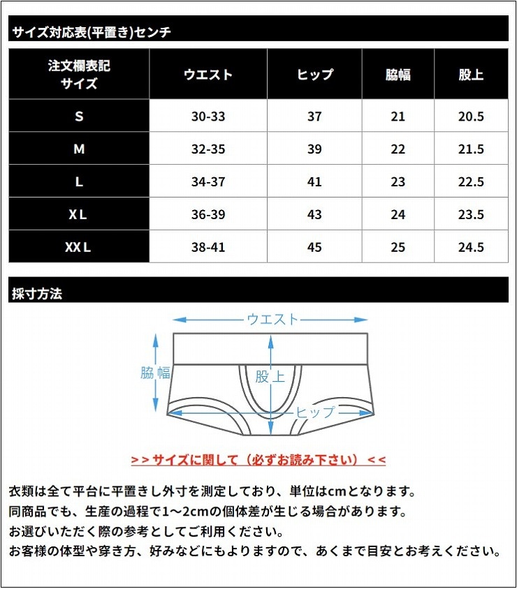ウエストサイズ(平置きの目安) S 約30-33cm M 約32-35cm L 約34-37cm XL 約36-39cm XXL 約38-41cm ※洗濯の際、他のものと分けてご面倒でも手洗いをおすすめします。洗濯後は形を整えてすぐに干してください。乾燥機の使用はお控えください。 ※生地にプリントしているため、伸縮時や縫製箇所等、色が薄く見える場合があります。 ※転写プリントのため、裏地は白色となります。 ※1枚のみでの販売です。