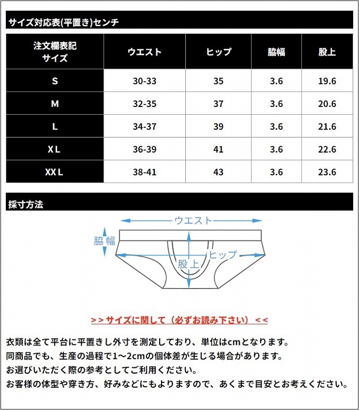 ウエストサイズ(平置きの目安) S 約28-31cm M 約30-33cm L 約32-35cm XL 約34-37cm XXL 約36-39cm 【ウエストサイズに関して】 同サイズを並べると若干差がございますが、伸縮性に優れた生地ですので着用するとカラダにフィットいたします。 ※洗濯の際、他のものと分けてご面倒でも手洗いをおすすめします。洗濯後は形を整えてすぐに干してください。乾燥機の使用はお控えください。 ※生地にプリントしているため、伸縮時や縫製箇所等、色が薄く見える場合があります。 ※転写プリントのため、裏地は白色となります。
