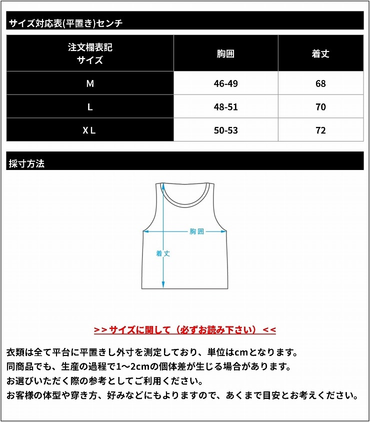 胸囲×着丈(平置き) M 約46-49×68cm L 約48-51×70cm XL 約50-53×72cm ※洗濯の際、他のものと分けてご面倒でも手洗いをおすすめします。洗濯後は形を整えてすぐに干してください。乾燥機の使用はお控えください。 ※生地にプリントしているため、伸縮時や縫製箇所等、色が薄く見える場合があります。 ※転写プリントのため、裏地は白色となります。 ※ノースリーブ1枚のみでの販売です。